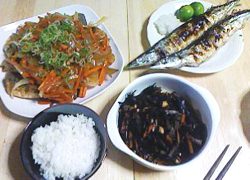 さんま、南蛮漬け、ひじきのヘルシー食事和食デス。